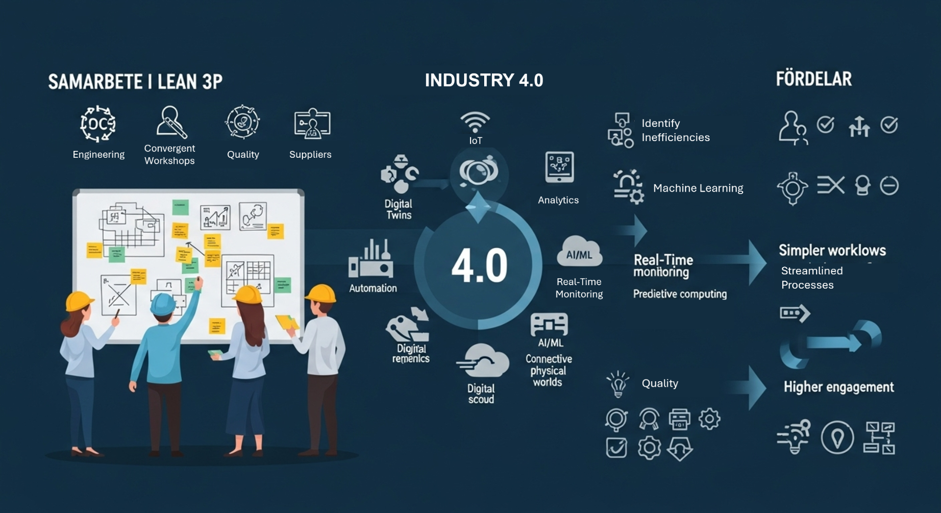 Det samarbetsinriktade arbetssättet för att designa både produkt och produktionsprocess står i centrum för Lean 3P (Production Preparation Process) och förstärks kraftigt när det integreras med Industri 4.0-teknologier och maskininlärning.